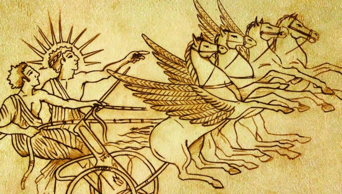 In the story of Phaeton, the son of Helios, the sun god, asks his father for permission to drive the chariot of the sun across the sky for one day. Despite his father’s warnings, Phaeton insisted on attempting the feat. First, he drove the sun chariot too high, causing the earth to freeze, then he drove the sun too close, causing the earth to burn, and the sea to dry up. The poet Ovid said that the Cyclade Islands became mountains and the Nile descended to the sea in a series of cataracts.