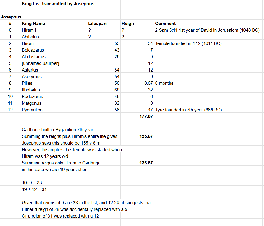 Table 1 lists the figures of Menander for the reigns of the kings of Tyre. Two problems arise from this data. Both the sum from the start of Hiram’s reign and the sum from the 12th year of Hiram’s reign fall 19 years short of the totals of 155 and 144 years given by Josephus. This suggests that there has been a scribal error when copying the reigns of one of the kings.