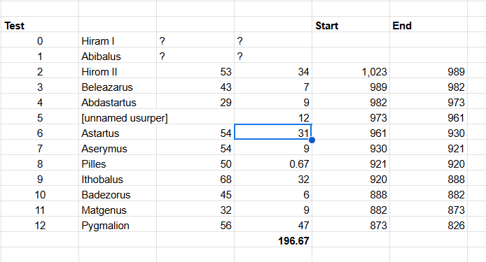 We conclude that while several solutions to the Ithobaal problem are possible, the most probable solution is to make the reign of Astartus 31 years. Table 2 can therefore be safely relied upon for the dates of the Kings of Tyre.