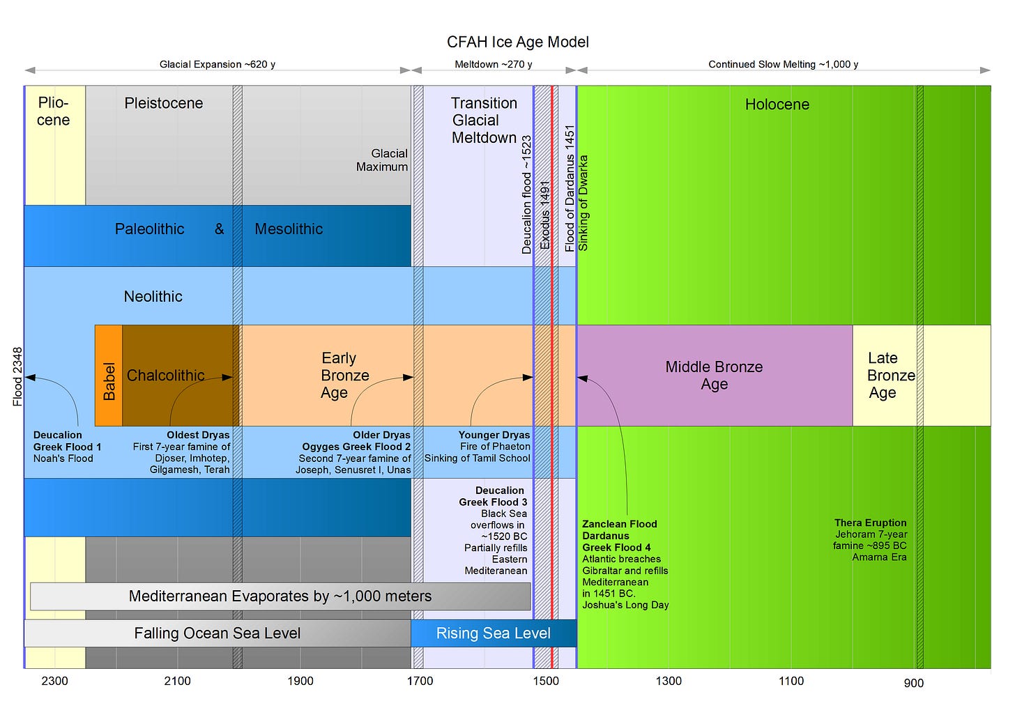 There are at least six lines of evidence that the Ice Age corresponded to the Early Bronze Age in human history, which also overlapped with the Stone Age. At the peak of the Ice Age, so much water was locked up in the North American, European, and Himalayan ice sheets that the global sea level was somewhere between 300 and 1,000 feet lower than today. Asia and North America were connected by the Bering Land Bridge. When the Ice Age ended, the meltwater raised the sea level back to its current height. There are historical records from three different cultures on different sides of the planet that the sea suddenly and catastrophically rose in 1451 BC, around the time of Joshua’s Conquest.